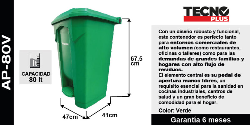 El Basurero Plástico de 80 Litros SOIN Verde es la solución de alta capacidad que tu negocio o gran residencia necesita para el manejo especializado de desechos. Su color verde lo designa como el punto ideal para la separación de vidrio o material orgánico, facilitando el cumplimiento de los programas de sostenibilidad.