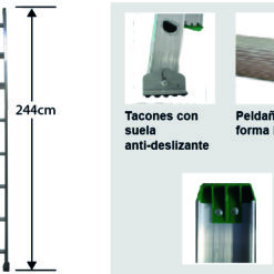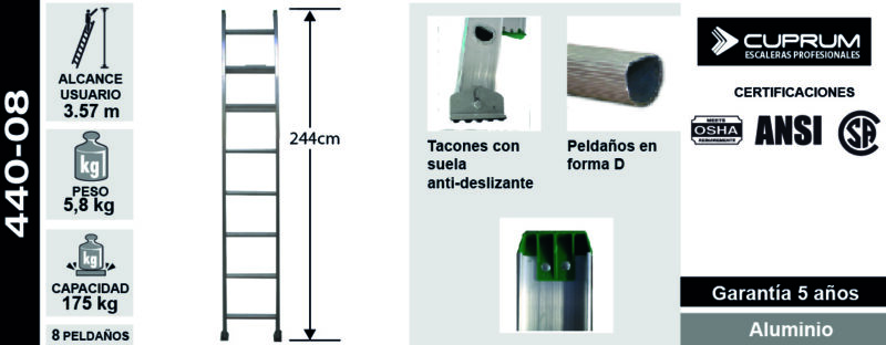 Escalera recta de aluminio con peldaño en “D” de 8 pies de altura y capacidad de carga 175 Kg. Tipo II.