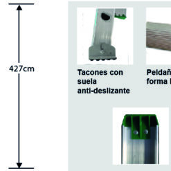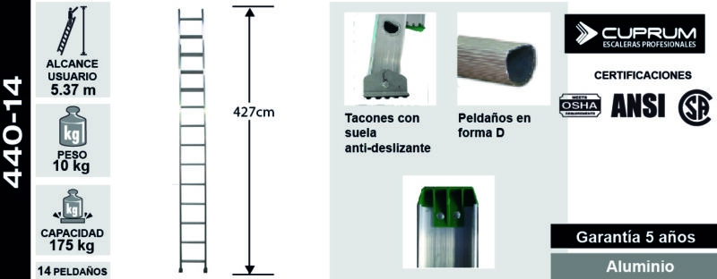 Escalera recta de aluminio con peldaño en “D” de 14 pies de altura y capacidad de carga 175 Kg. Tipo II