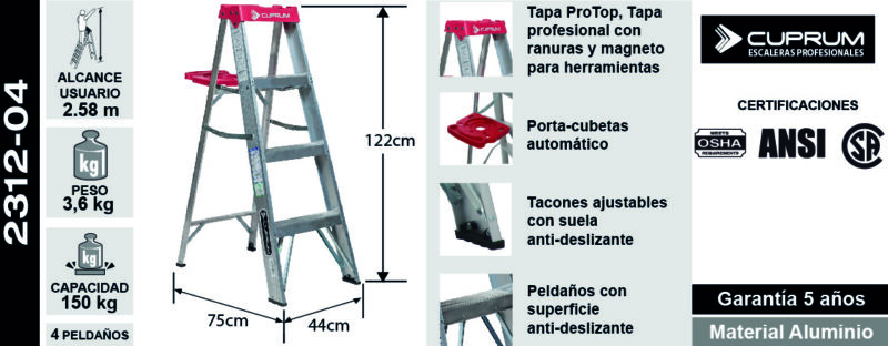 ESCALERA ALUMINIO TIJERA 1.22 MTS 4 PELDA OS 150 KG CUPRUM