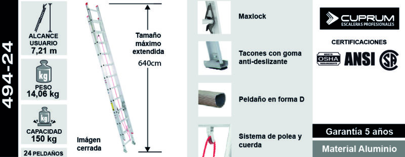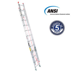 Escalera de extensión de aluminio con peldaño en “D” de 24 pies de altura y capacidad de carga 150 Kg. Tipo III.
