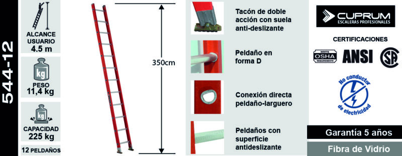 Escalera recta de fibra de vidrio con peldaño en “D” de 12 pies de altura y capacidad de carga 225 Kg. Tipo IA.