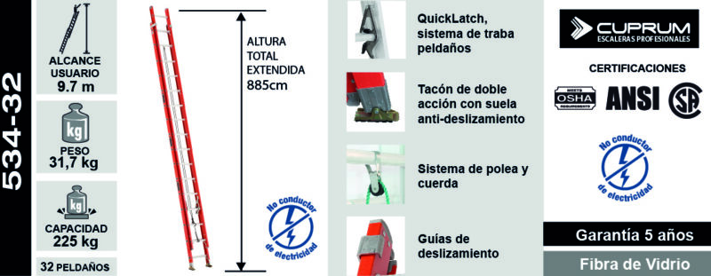 Escalera de extensión de fibra de vidrio con peldaño en “D” de 32 pies de altura y capacidad de carga 225 Kg. Tipo IA