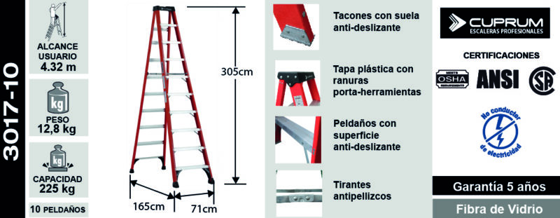 ESCALERA FIBRA VIDRIO TIJERA 3.05 M. 225KG CUPRUM