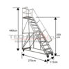 Escalera de Acero, con 4 ruedas de gran calidad, 2 fijas y 2 giratorias con freno para mayor seguridad. Ideal para trabajos en altura, cuenta con barandal de apoyo y peldaños de malla antideslizantes.
