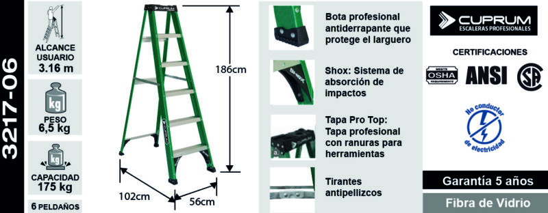 Descubre la seguridad y el confort que proporciona nuestra escalera de fibra de vidrio tipo tijera de 6 peldaños. Certificada para garantizar una estabilidad óptima, esta escalera es perfecta tanto para uso en interiores como en exteriores. Su estructura aislante la convierte en la opción ideal para trabajos en entornos eléctricos, mientras que los peldaños antideslizantes aseguran un uso seguro en todo momento.