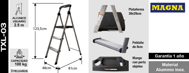 TXL-03. Su estructura de aluminio de alta resistencia soporta hasta 100 kg, ofreciendo una solución técnica para el mantenimiento ligero en bodegas y negocios. Cuenta con una manilla de seguridad extendida que garantiza un punto de apoyo ergonómico para el operario. Su acabado no oxidante lo hace apto para entornos con protocolos de higiene exigentes.